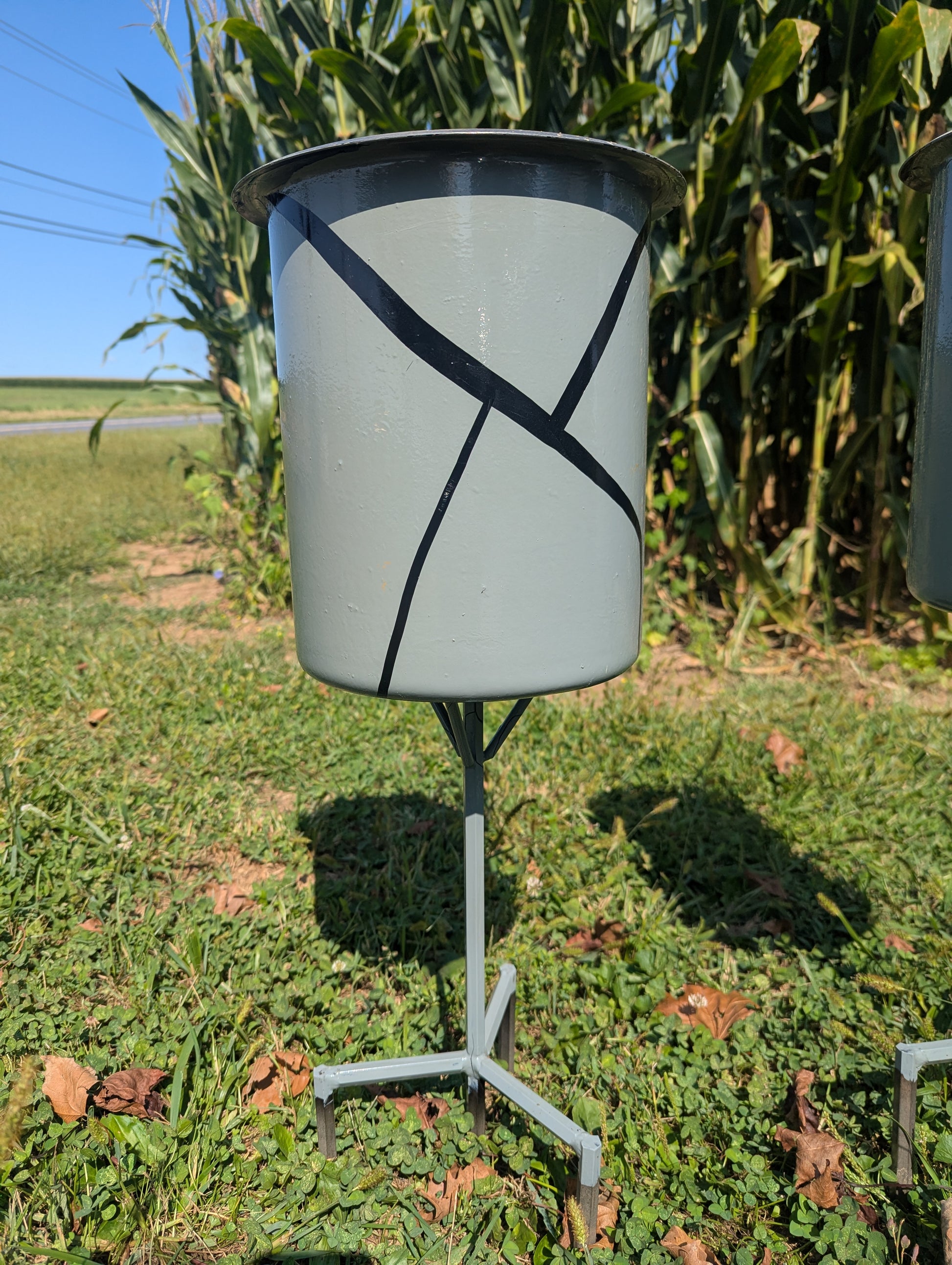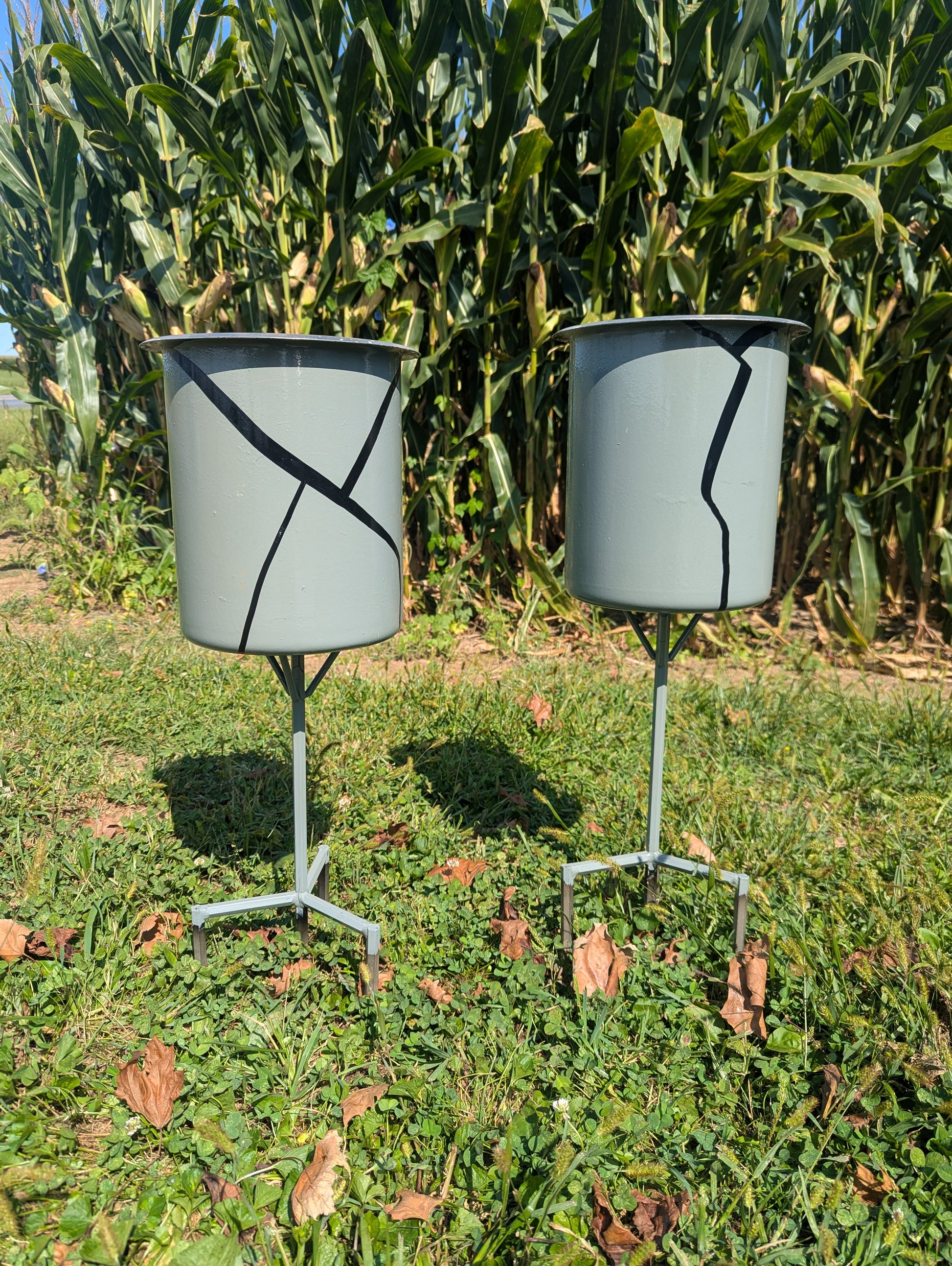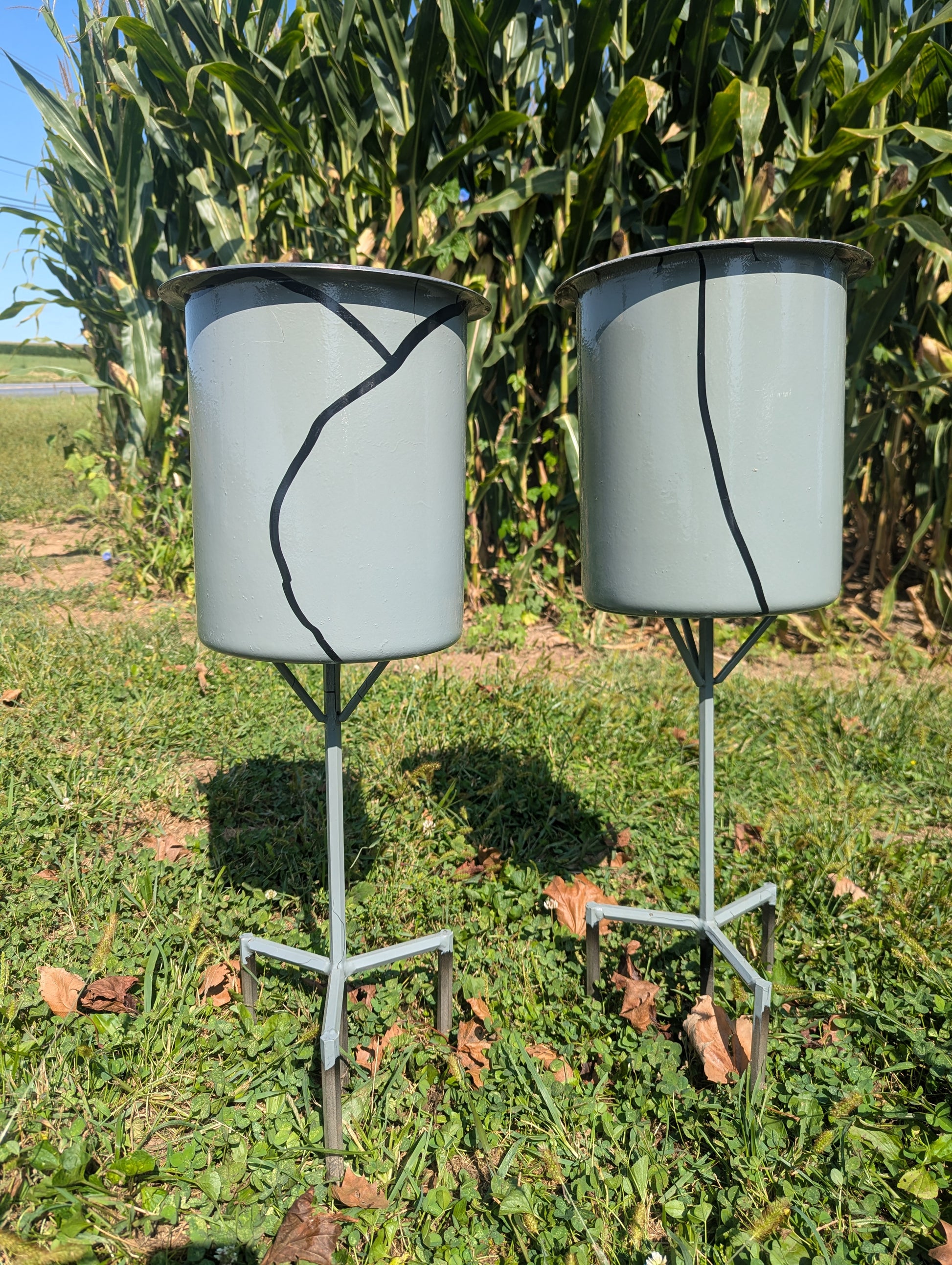 These are the only two of these planters available, the color/style would not be able to be duplicatedĀ This 2' stainless planter is designed to last all year long. With a height of 11" and a diameter of 9", it is the perfect size for displaying mums or other fall decor. The pot stakes 6" into the ground for stability and durability. Please note that there are only two of these planters available and the color/style cannot be replicated.