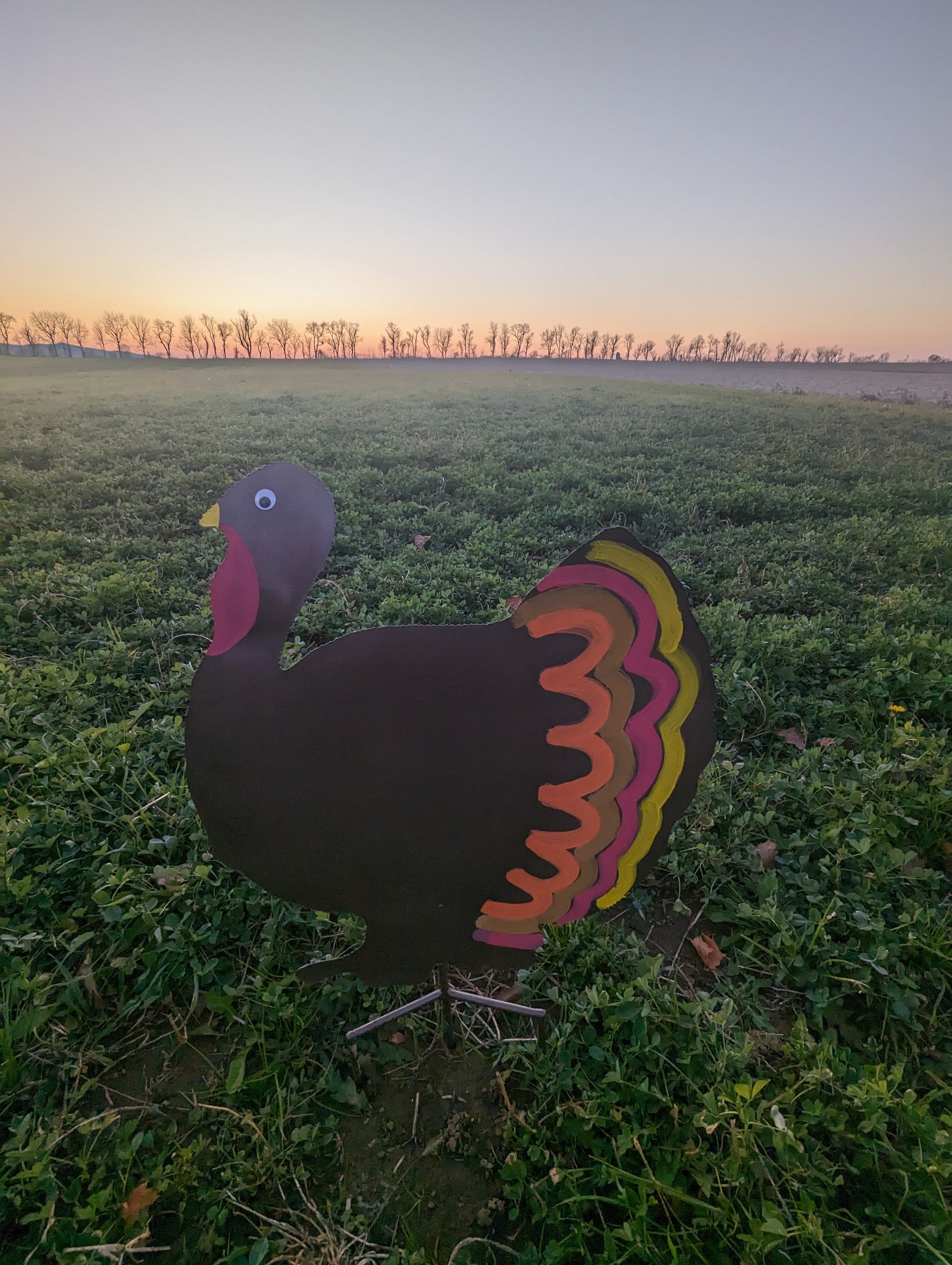 Im ground turkey decor around 2 and a half feet tall This in-ground turkey stands tall at around 2 and a half feet with 4 inch stakes for easy installation. Perfect for adding a festive touch to your outdoor decor. Made with durable materials to withstand any weather.